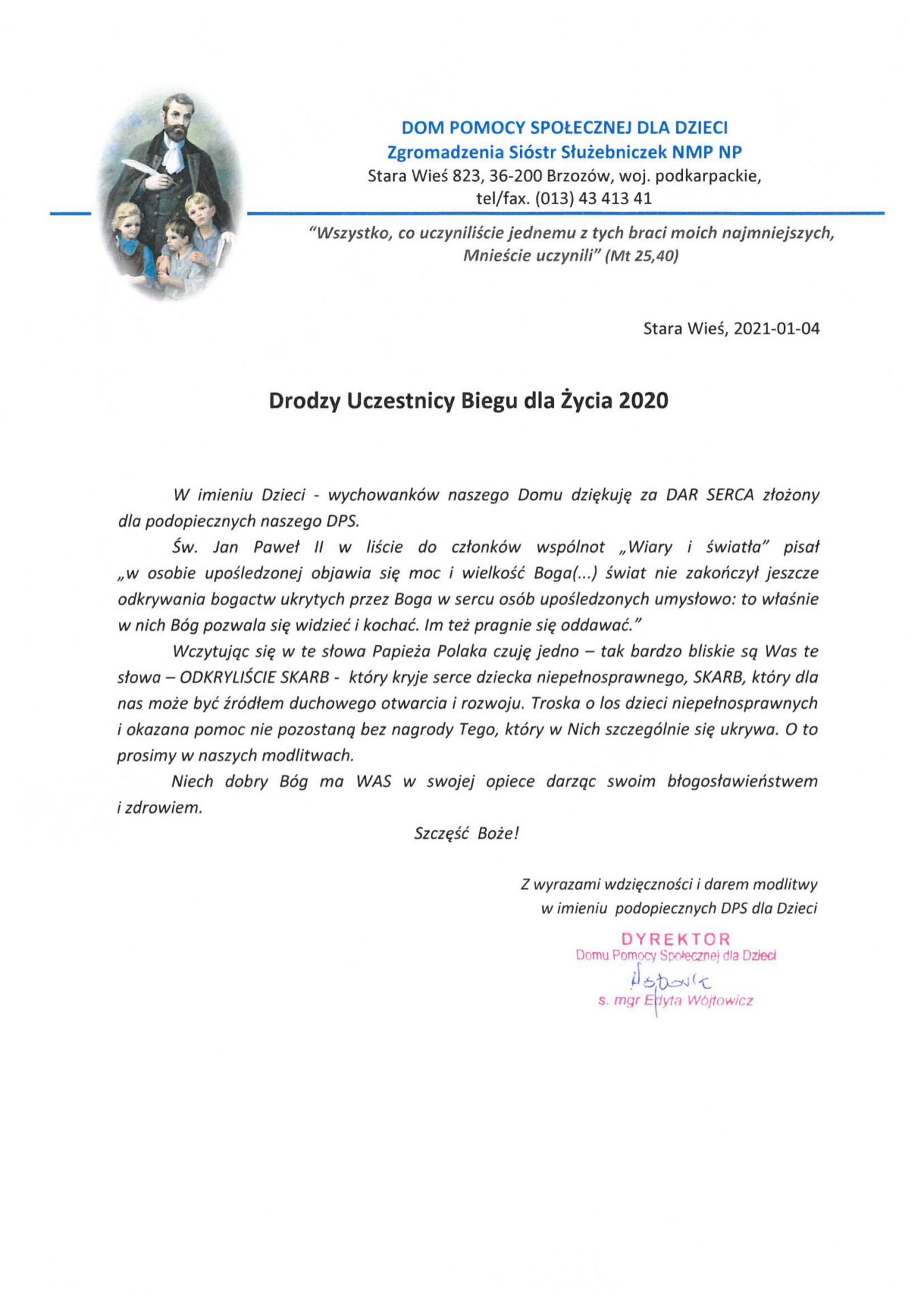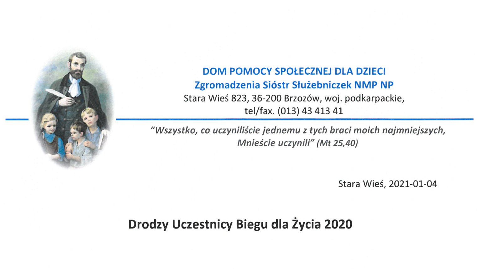 Zgodnie z regulaminem edycji Biegu 2020, przekazaliśmy 10% waszych wpisowych na działalność Domu Pomocy Społecznej dla dzieci w Starej Wsi. Dziękujemy!